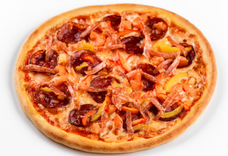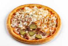Сальса, моцарелла, колбаски охотничьи, салями, томат, огурец солёный, сухой чили