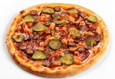 Томатный соус, моцарелла, маслины, лук, шампиньоны, ветчина, огурец солёный