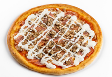 Томатный соус, моцарелла, ветчина, шампиньоны, чесночный соус