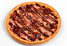 Томатный соус, моцарелла, филе куриное, бекон, лук маринованный, соус барбекю