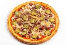 Томатный соус, моцарелла, охотничьи колбаски, лук, огурец солёный